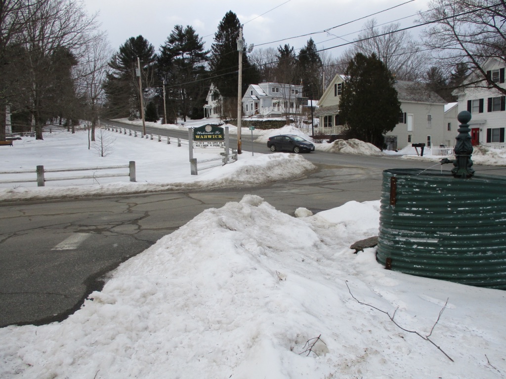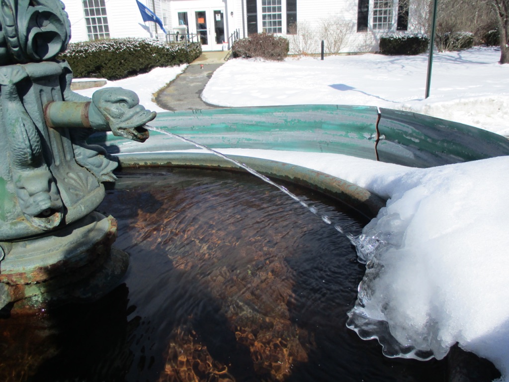 Winter scene showing sleeve protecting fountain from freezing temperatures. Source: Ivan Ussach, librarian of the Warwick Free Library.