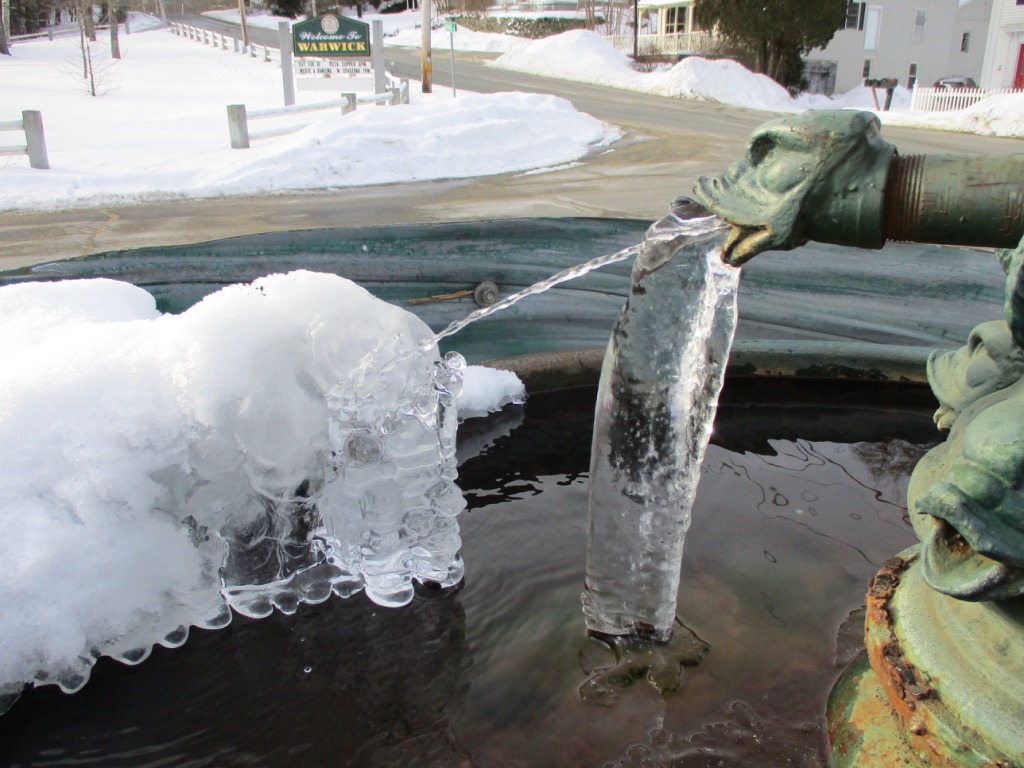 Water jetting out of the jug filler of Captain Ball's Fountain creating ice sculptures in the winter temperatures. Warwick town common and town sign in background.  Source: Ivan Ussach, librarian of the Warwick Free Library.