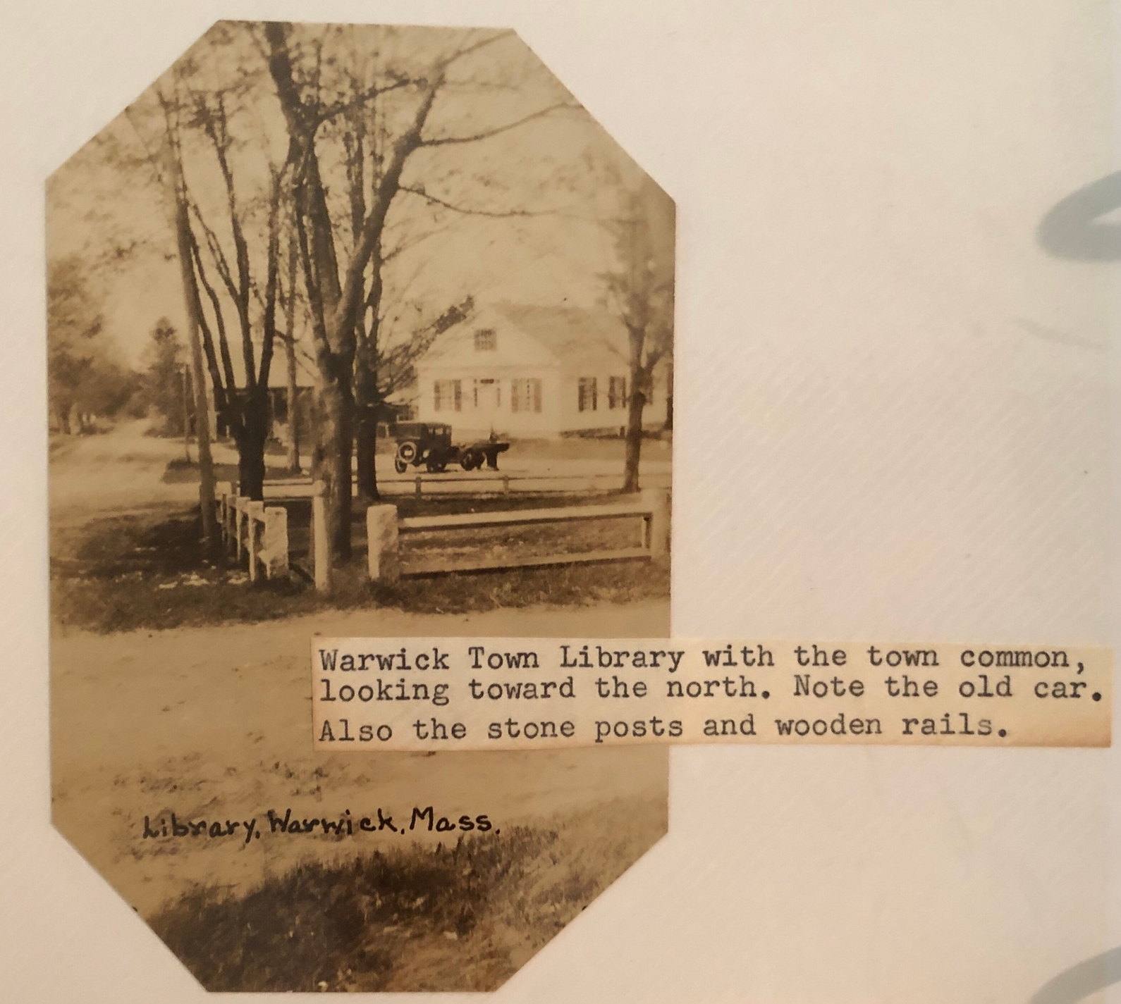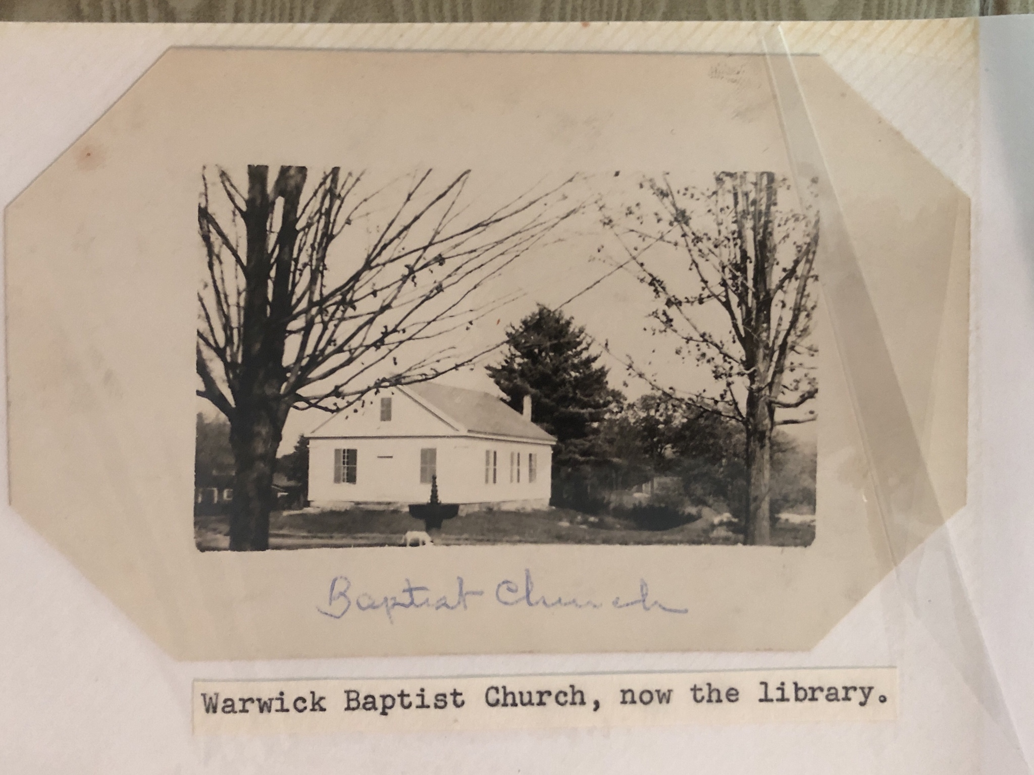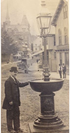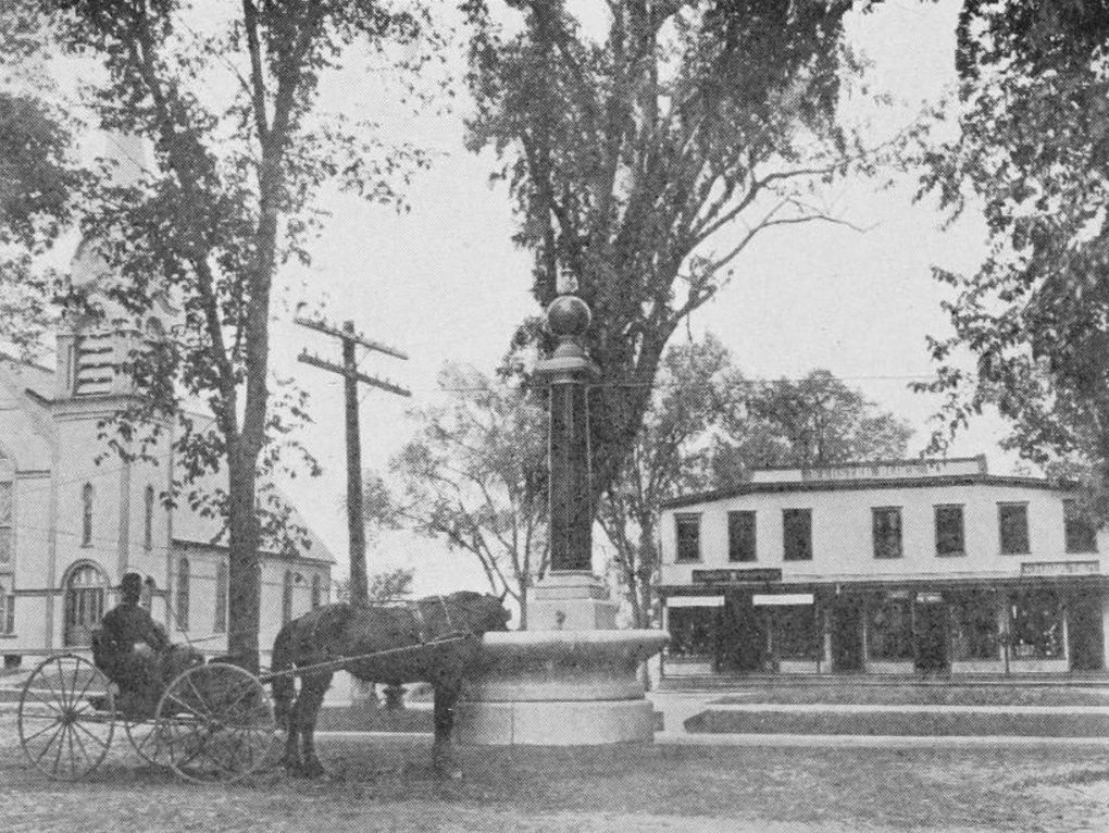 Image of captain Ball's Fountain in front of Warwick Free Library before addition built. Note dog drinking from basin below. Source: Warwick Historical Society