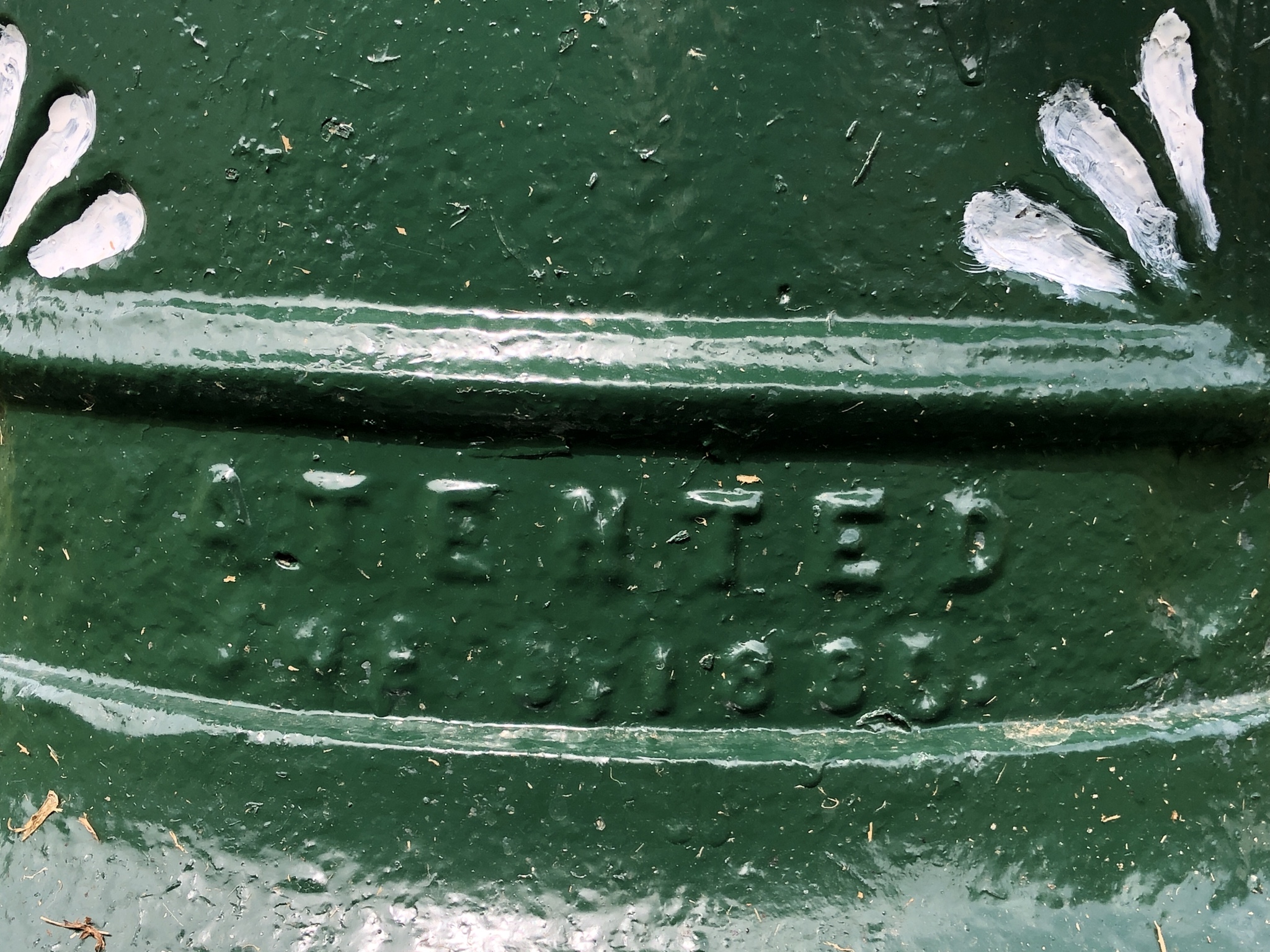 Close-up of pedestal of the fountain, declaring an illegible patent number