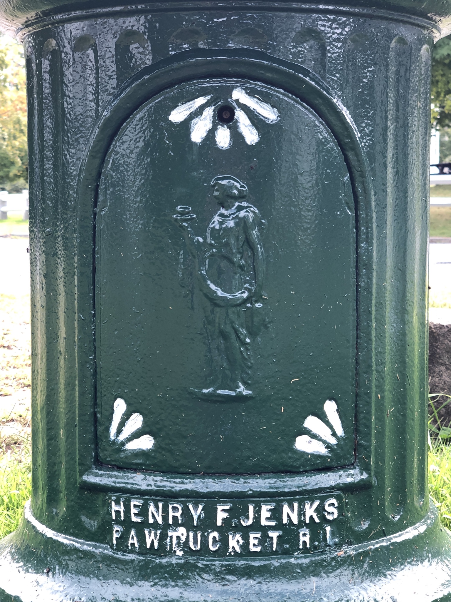 Close-up image of pedestal of the fountain, showing name of Henry F. Jenks and motif of native American