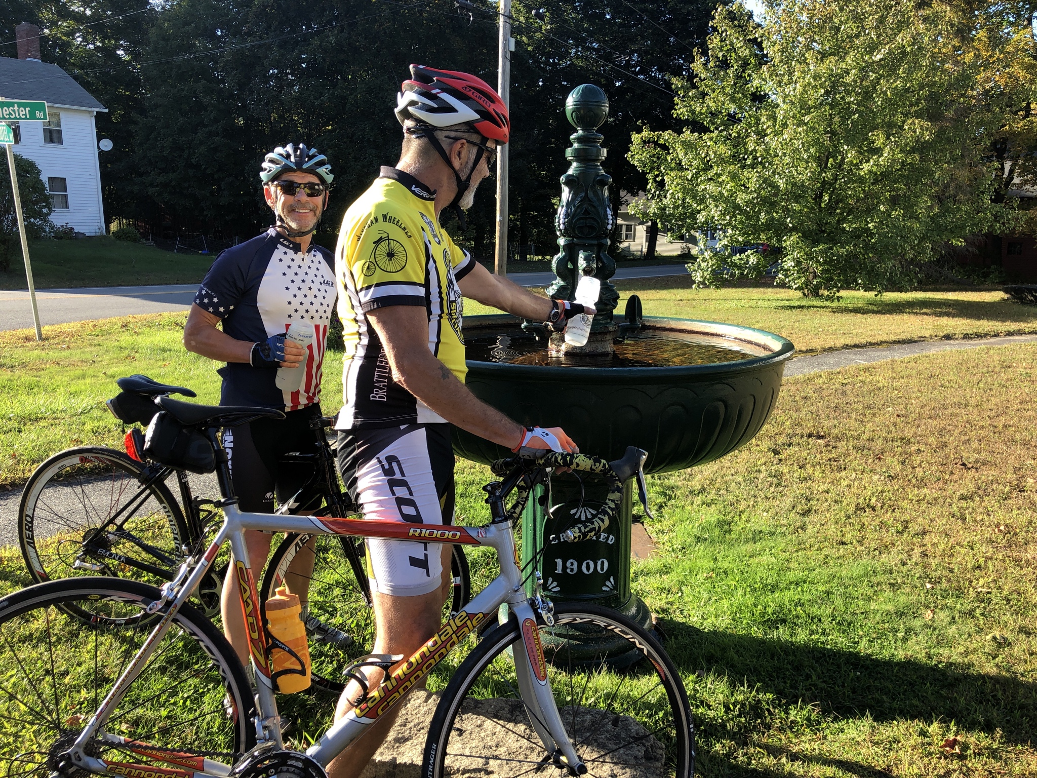 Cyclists filling their water bottles from Captain Ball's Fountain, 2019