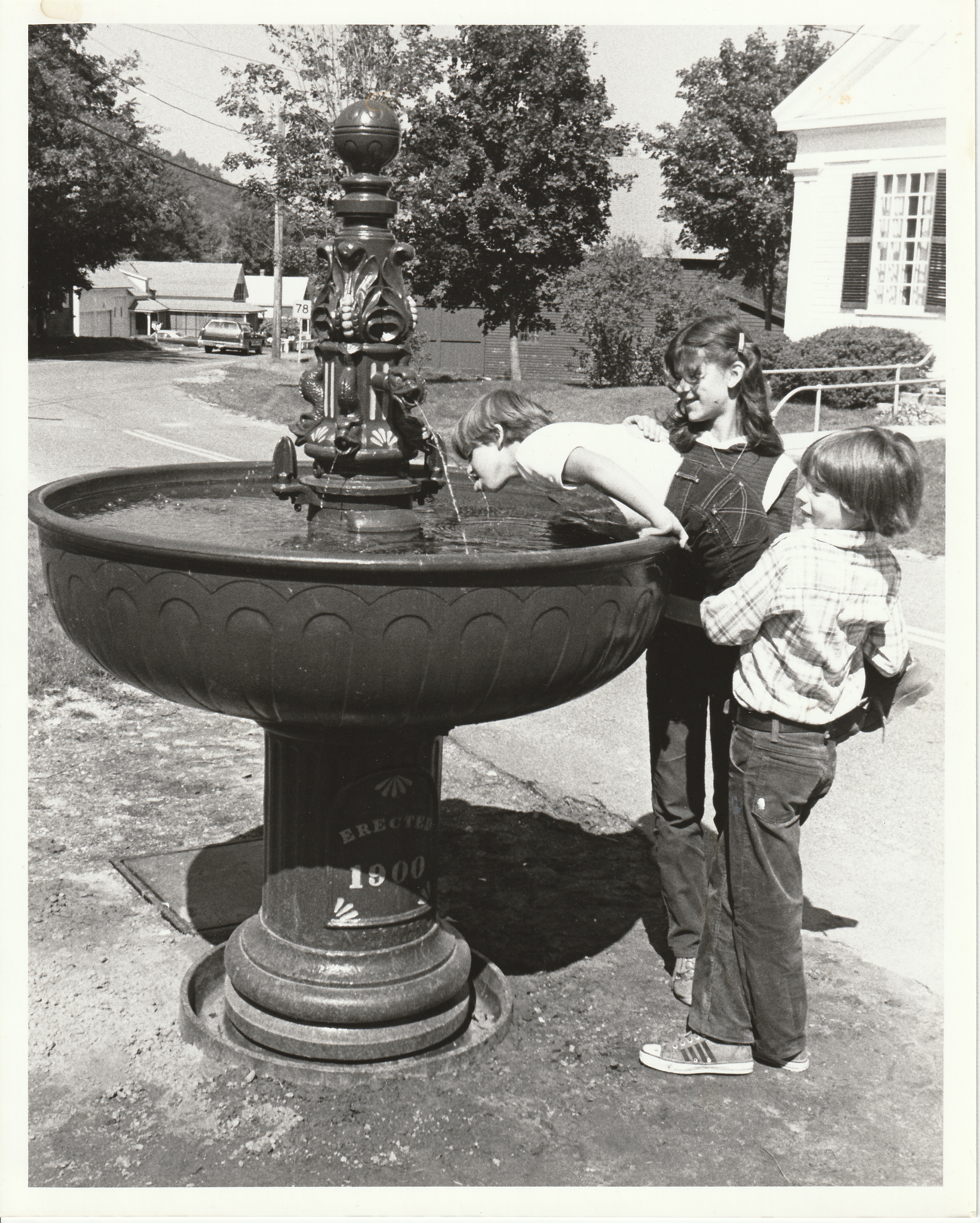 Image of Captain Ball's Fountain after repair work, September 1979. Children are Larry Kilroy, Jr., Jim Kilroy, and Kim Astrella. Source: Arland G. Day Jr and Greenfield Recorder