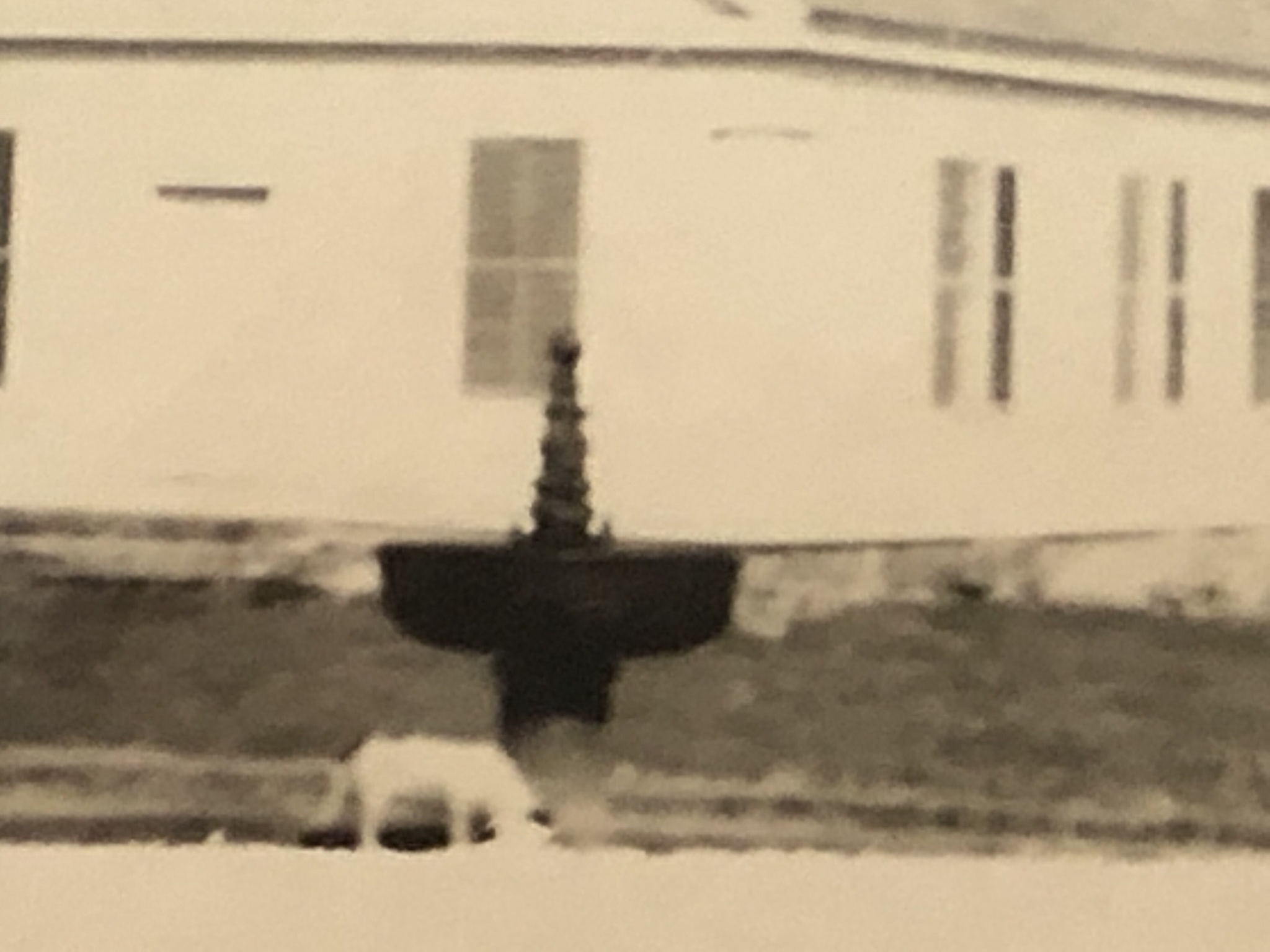 Image of dog drinking from Captain Ball's Fountain, detail view taken from larger image. Source: Warwick Historical Society